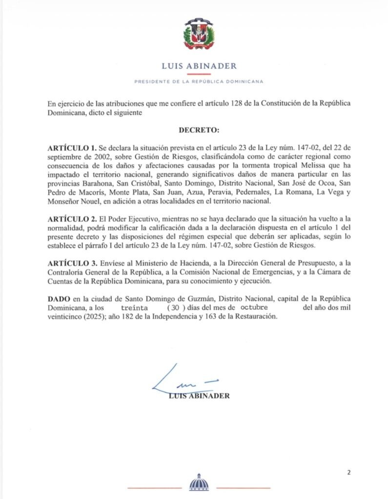 SANTO DOMINGO.- El presidente Luis Abinader declaró el viernes 31 una situación de emergencia regional en varias provincias del país, debido a los significativos daños ocasionados por Melissa, que afectó el territorio nacional con intensas lluvias, deslizamientos de tierra e inundaciones.
