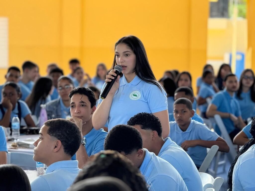 Durante el acto, la estudiante Wilianny Alibeth Peguero Fernández agradeció la construcción de los techados de cancha y destacó que el espacio promoverá disciplina, trabajo en equipo y convivencia.