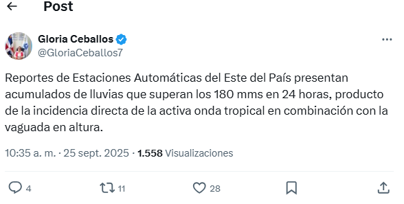Acumulados de lluvias en el este del país superan los 180 milímetros, indica Gloria Ceballos
