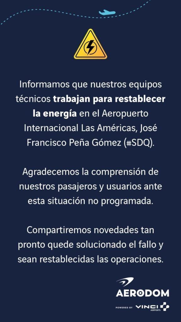 La información fue confirmada por el director de Comunicación Corporativa de Aeropuertos Dominicanos Siglo XXI (Aerodom), José Luis López, quien explicó que la falta de energía ha provocado la detención de vuelos.