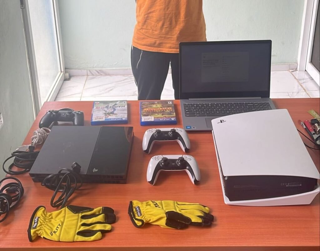 Entre los artículos recuperados se encuentran una laptop color gris, dos guantes, dos controles (uno blanco con negro, otro negro), dos discos de videojuegos, dos consolas Playstation 5 (negra y blanca y dos cables.