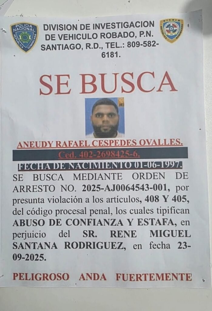 La orden de arresto No. 2025-AJ0064543-001 fue emitida, tras una denuncia presentada por René Miguel Santana Rodríguez, el 23 de septiembre de 2025, según consta en el documento judicial.