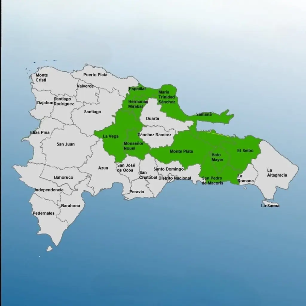 Las provincias en alerta verde son: Espaillat, Hato Mayor, Monseñor Nouel, El Seibo, María Trinidad Sánchez, La Vega, Hermanas Mirabal, San Pedro de Macorís, Samaná y Monte Plata.