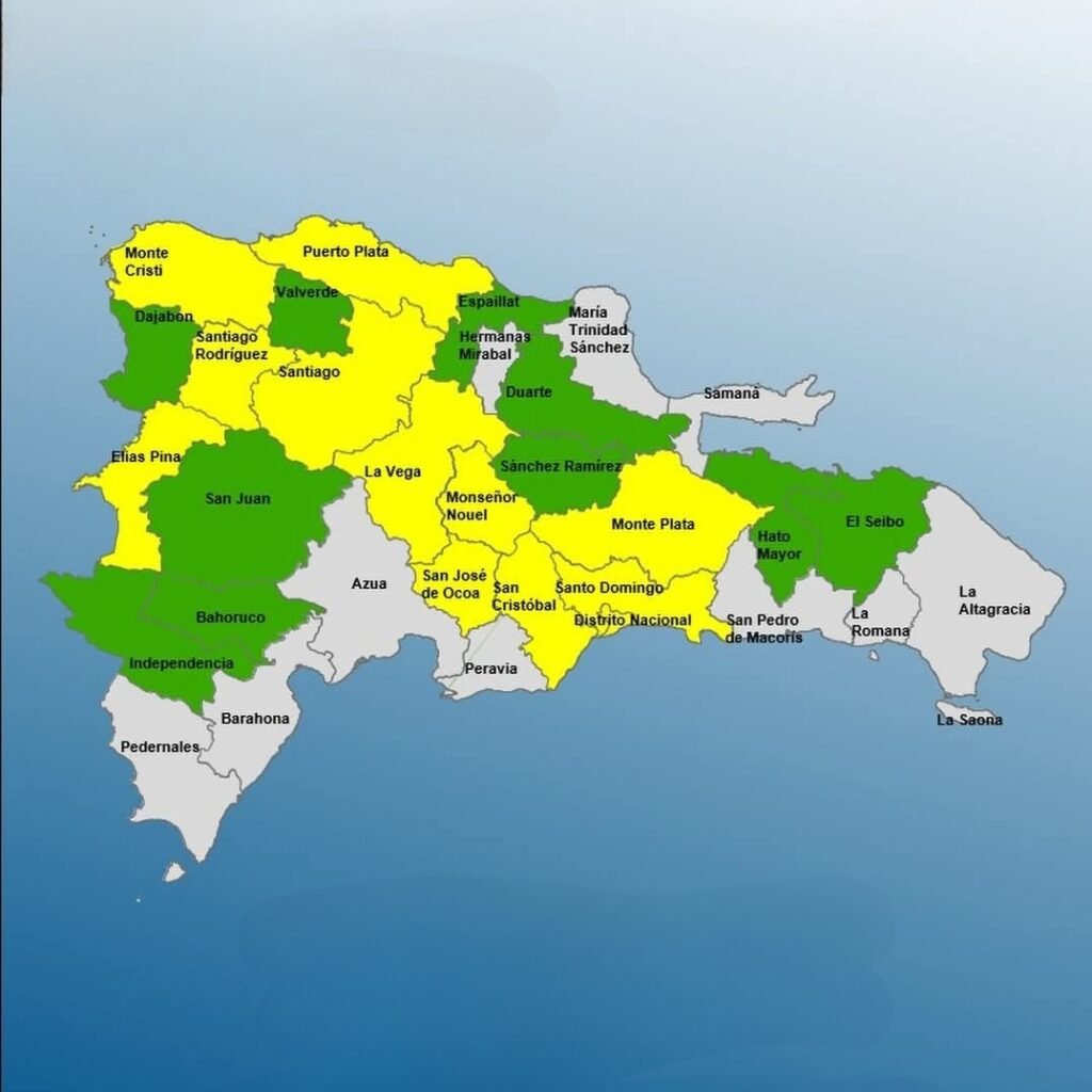 Las provincias en alerta amarilla son: Monseñor Nouel, Santiago Rodríguez, Santiago, La Vega, Monte Cristi, Elías Piña, Puerto Plata, San Cristóbal, Santo Domingo, Distrito Nacional, Monte Plata y San José de Ocoa.