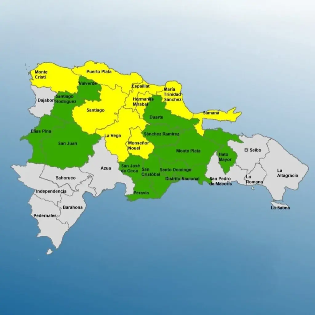Mientras que las provincias en alerta verde son: Santiago Rodríguez, Elías Piña, Duarte (especialmente el Bajo Yuna), Santo Domingo, Sánchez Ramírez, Monte Plata, Peravia, Valverde, San Cristóbal, Hato Mayor, San José de Ocoa, Distrito Nacional y San Juan.