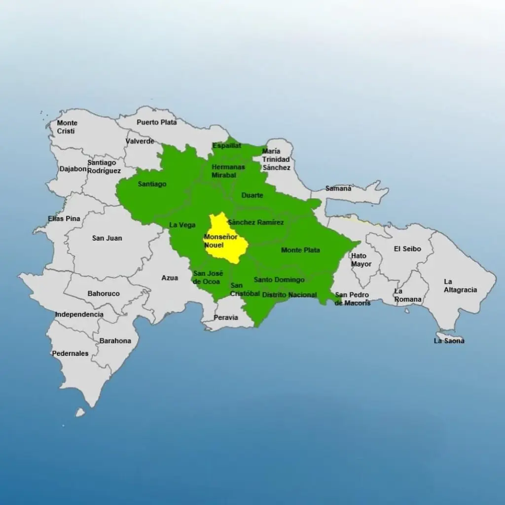 Mientras que las provincias en alerta verde son: Santo Domingo, Distrito Nacional, Sánchez Ramírez, Hermanas Mirabal, San Cristóbal, Santiago, Espaillat, Duarte, La Vega, San José de Ocoa y Monte Plata.