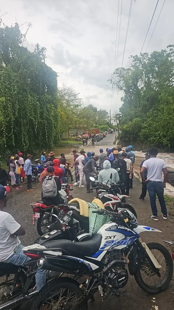 Uno de los casos más críticos se presenta en la carretera Hato Mayor–Yerba Buena, donde el arroyo Ceiba aumentó considerablemente su caudal, impidiendo el paso vehicular y peatonal. En el lugar, varias personas permanecen a la espera de que el nivel del agua descienda para poder continuar su trayecto de manera segura.