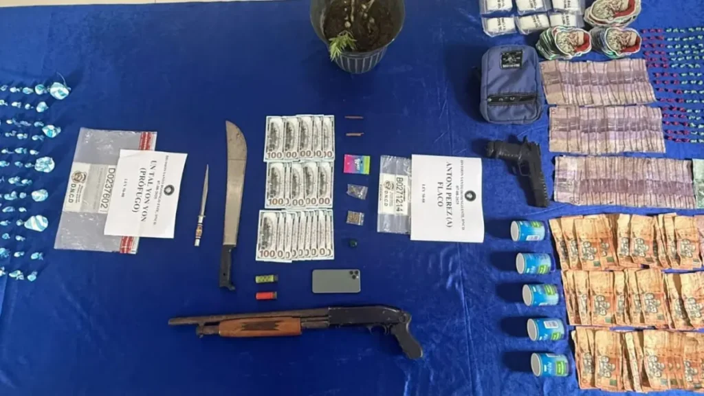 En el operativo, se incautaron, además, dos balanzas, dos celulares, una escopeta calibre 12, con varios cartuchos, una pistola plástica (tipo Bélica), un cuchillo, una radio de comunicación, decenas de fundas de distintos colores, cinco envases para la elaboración y empaque de sustancias narcóticas y 23,645 pesos dominicanos, entre otras evidencias.