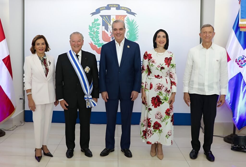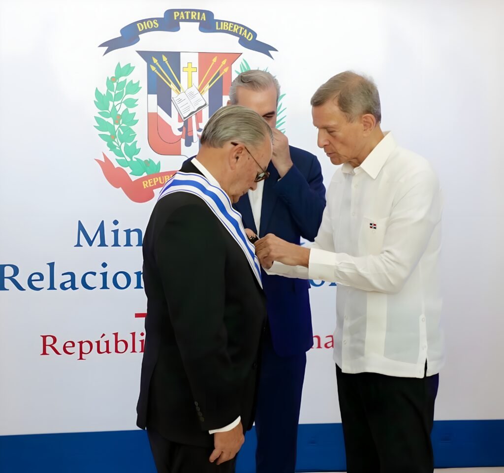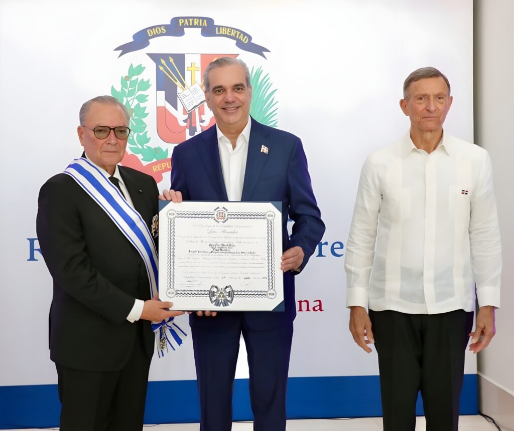 SANTO DOMINGO. – El Gobierno condecoró este miércoles al empresario y embajador Frank Rainieri Marranzini con la Orden del Mérito de Duarte, Sánchez y Mella en el Grado de Gran Cruz Placa de Plata, en reconocimiento a sus más de cinco décadas de contribución al desarrollo del turismo en el país y a su labor solidaria como representante de la Soberana y Militar Orden Hospitalaria de San Juan de Jerusalén, de Rodas y de Malta en República Dominicana.