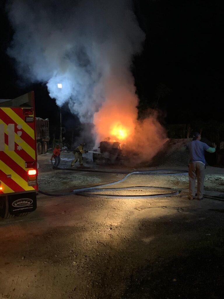 HATO MAYOR.– Un incendio vehicular se registró en la tarde-noche del martes en la carretera Hato Mayor–El Seibo, específicamente en el kilómetro 2, en el taller conocido como el taller de los Hermanos de los Santos, también llamado taller de los Milton.