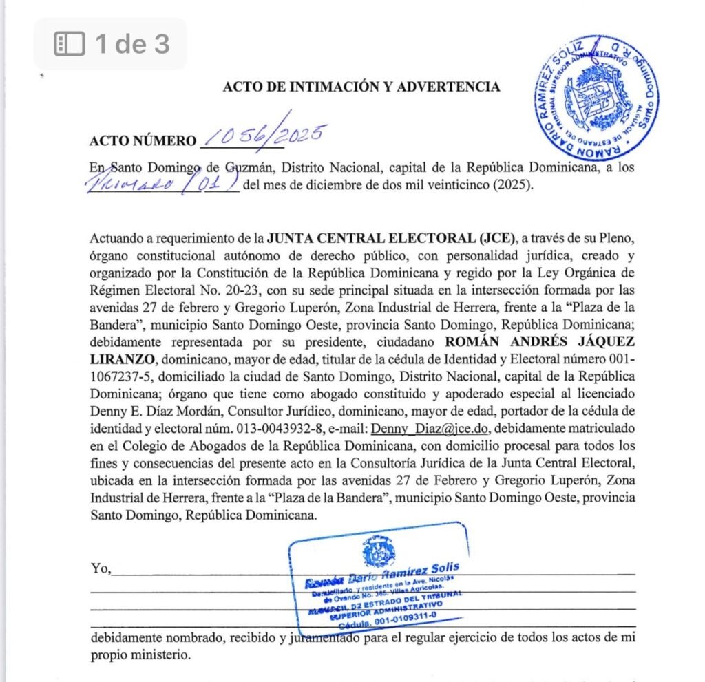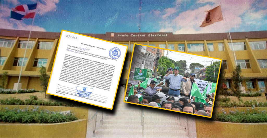 El acto de intimación emitido por el Pleno de la JCE y notificado a través de un alguacil, advierte que la manifestación convocada por Fuerza del Pueblo utilizó símbolos, colores, consignas y emblemas propios del partido, así como la presencia de dirigentes, elementos que según el órgano electoral podrían configurarse como propaganda político-partidaria realizada fuera del período permitido.