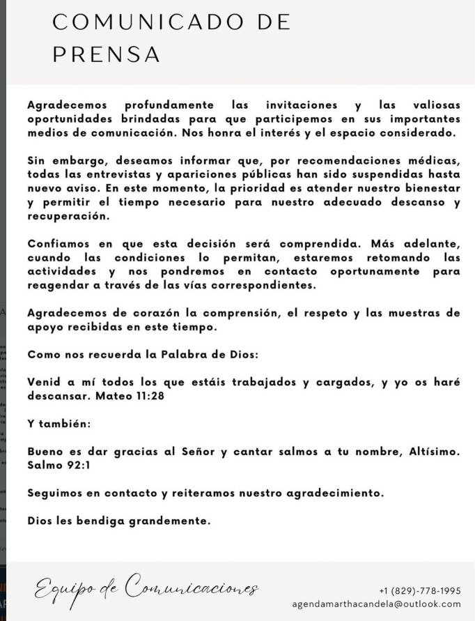 SANTO DOMINGO. – La cantante cristiana Martha Candela informó este lunes que hará una pausa temporal en todas sus entrevistas y apariciones públicas atendiendo a recomendaciones médicas, según comunicó a través de un mensaje difundido en su cuenta de Instagram.