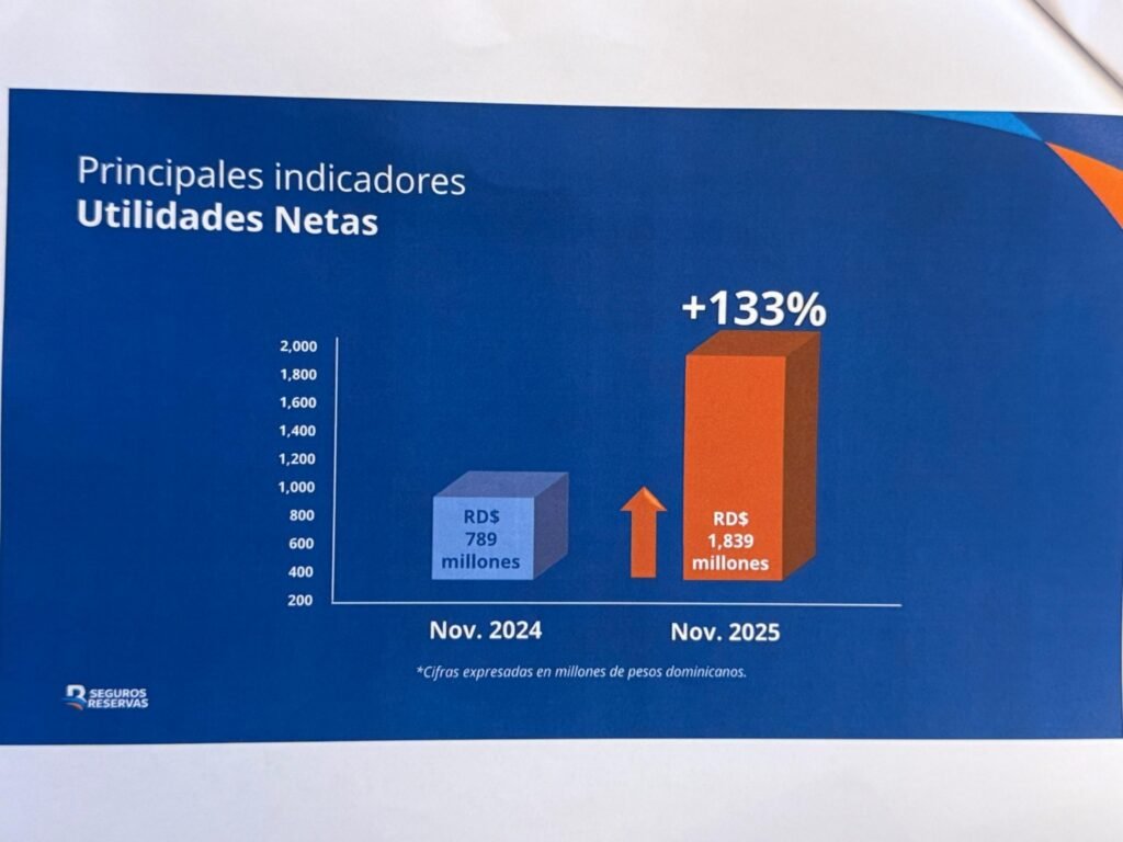 El funcionario dijo que el 2025 ha sido extraordinario para Seguros Reservas, aumentando sus utilidades en un 133 %, pasando de RD$789 millones a noviembre 2024 a RD$1,839 millones al mismo mes 2025.