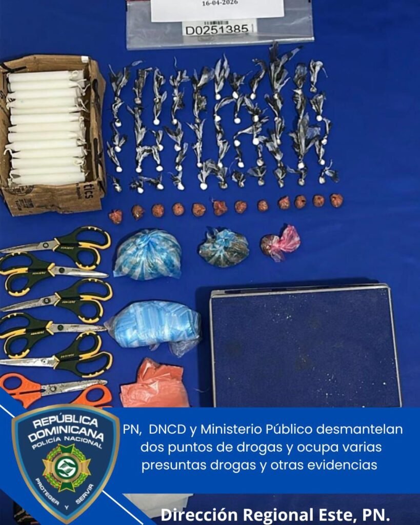 LA ROMANA. – Miembros de la Policía Nacional, en coordinación con la Dirección Nacional de Control de Drogas (DNCD), agentes de la Subdirección Regional Este de Investigación (DICRIM) y representantes del Ministerio Público, desmantelaron dos puntos de venta de sustancias controladas durante operativos realizados en esta provincia.