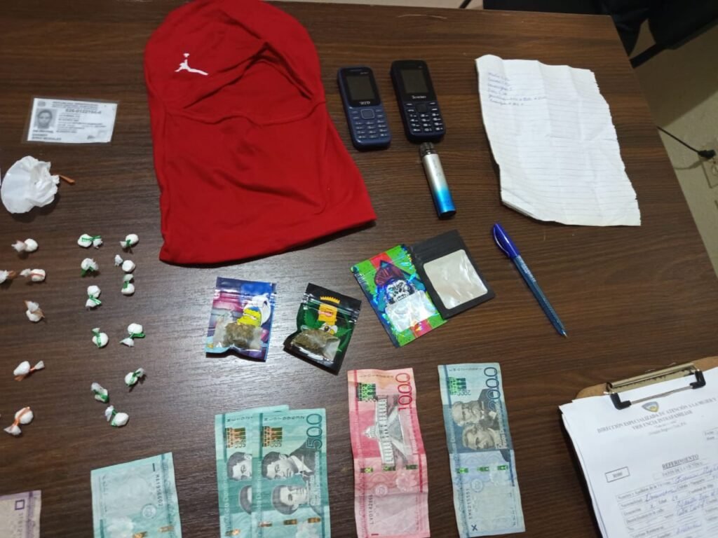 Al realizar un registro, encontraron en su poder una cartera tipo canguro con 35 porciones de posible cocaína, dos envoltorios de probable marihuana y dos teléfonos celulares. Además, se le incautó la suma de 5,100 pesos, un dólar americano, un vaper y un pasamontaña.