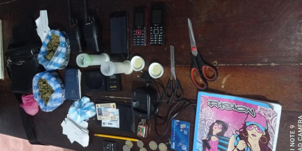 Establece la policía que los individuos al notar la presencia policial intentaron escapar ocupandole a Kelvin Celestine Diez, un bolso negro conteniendo en su interior (1) polvo blanco presumiblemente cocaína, envuelta en una funda azul y blanco, (2) dos fundas de un vegetal verde, presumiblemente marihuana, (11) pastillas color verde, (1) balanza color rojo, (2) radios de comunicación color negro, (1) un cargador para las mismas marca Badfeng, (2) tijeras, (3) celulares color negro, (1) libreta color rosado con negro, y un llavero con varias llaves.