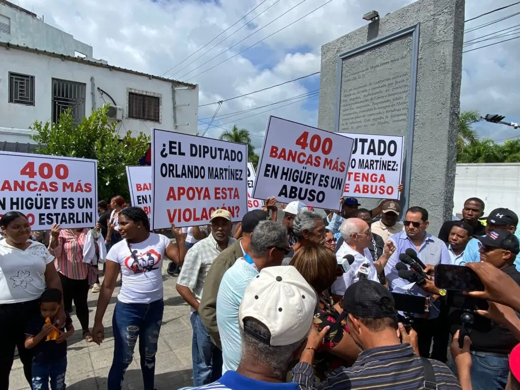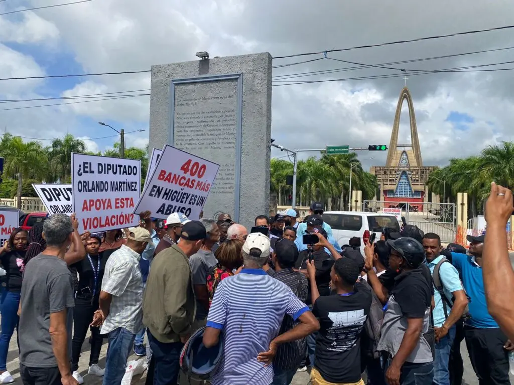 HIGÜEY.– Decenas de pequeños propietarios de bancas de lotería en este municipio protestaron encadenados este viernes frente a la Basílica Nuestra Señora de La Altagracia, exigiendo al diputado Orlando Martínez y al consorcio Real detener la instalación de más de 400 nuevas bancas en Higüey, una situación que —según denuncian— amenaza con provocar la quiebra del sector y afectar el sustento de numerosas familias.
