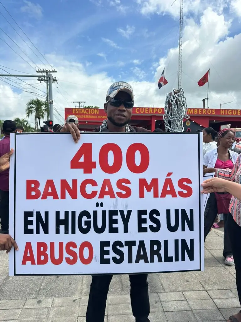 Protestan encadenados en Higüey y exigen al diputado Orlando Martínez y al consorcio Real detener la colocación de más de 400 bancas
